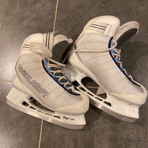 Bauer Ishockeyskøyter i størrelse 36 for barn. Skøytene er designet for ishockey og har en kombinasjon av svart og hvit farge. Egnet for bruk på is for barn som spiller ishockey.