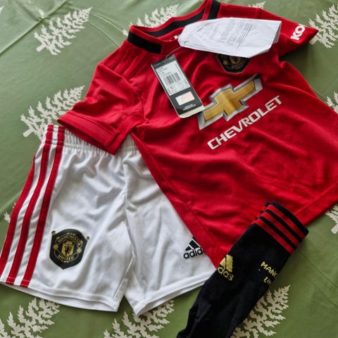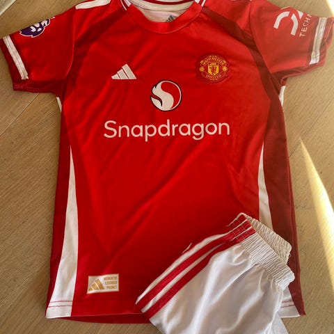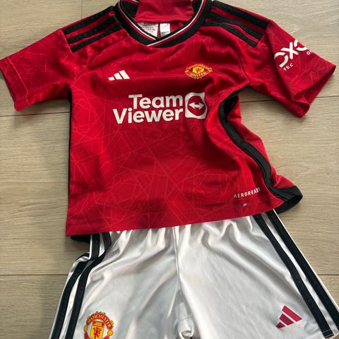 Manchester United fotballdrakt for barn 2025/26, aldri brukt fordi barnet foretrekker et annet lag, størrelse 18, passer barn 4 til 5 år, høyde 105 til 115 cm, se bilde 4 for mål, trøye og shorts inkludert, nummer 8 Bruno Fernandes, ny tilstand, kan sendes