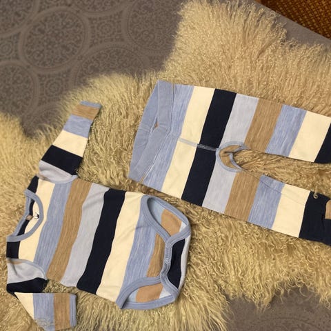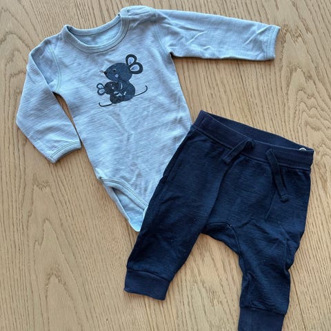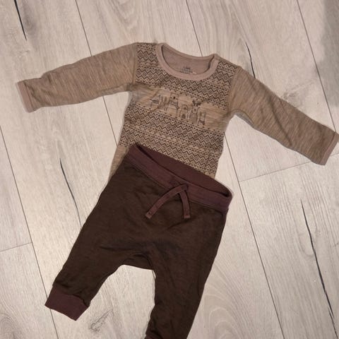 Selger et pent brukt ull/bambus sett fra Hust & Claire i str.68. Finner ingen anmerkninger på settet. Ser det kan være antydning til noe nupper enkelte steder.