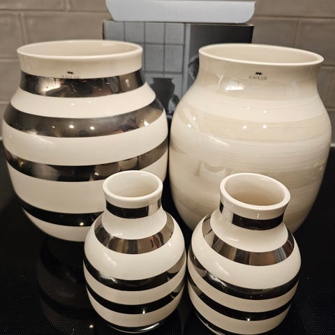 Kähler Vase med dekorative sølvstriper. Laget i keramisk materiale med et mønster av brede, horisontale sølvstriper på kremhvit bakgrunn. Passer til dekorasjon i ulike rom.