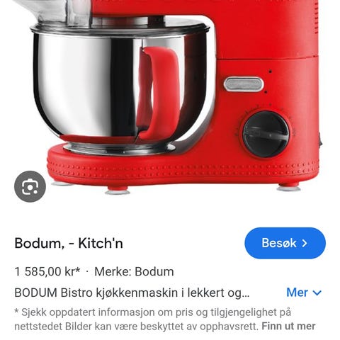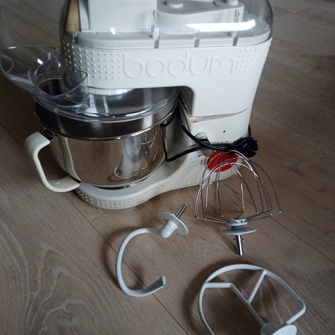 Bodum kjøkkenmaskin i rød farge med rustfri stålbolle. Leveres med visp og deigkrok. Egnet for baking og matlaging som krever elting og visping.