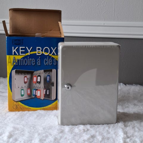 Nøkkelskap med plass til 4 nøkler mangler krok på døren og et lite hakk i kanten se bilder ellers pent. Kjøper betaler eventuell frakt
