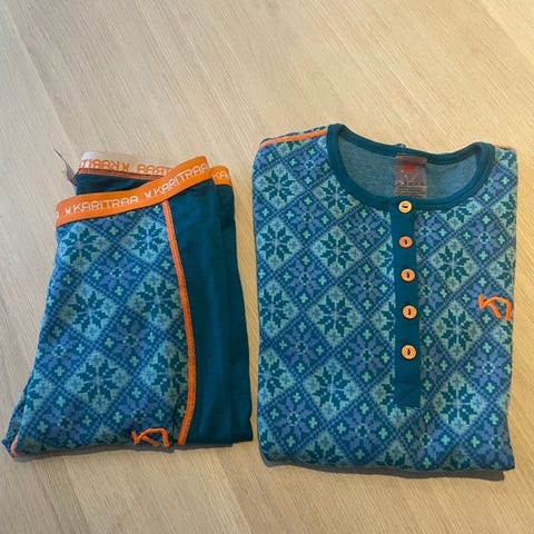 Pent og svært lite brukt ullundertøy i størrelse M fra Kari Traa. Half zip ulltrøye og ullbukse av merinoull. Selges samlet som sett.