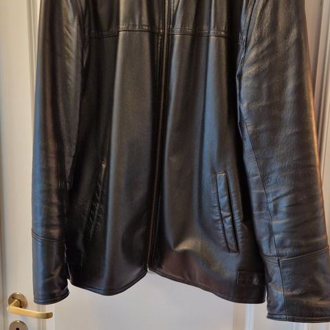 Aleksander of Norway skinnjakke i svart farge, størrelse 56. Jakken har et lite hull på den ene armen (kan sikkert limes) og det er hull i foret i den ene indre lommen. Veldig godt brukt. Selger den derfor billig!