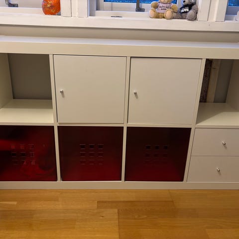 IKEA Kallax oppbevaringshylle i hvit farge. Består av åtte kvadratiske rom for oppbevaring. Passer til organisering av ulike gjenstander i hjemmet eller på kontoret.