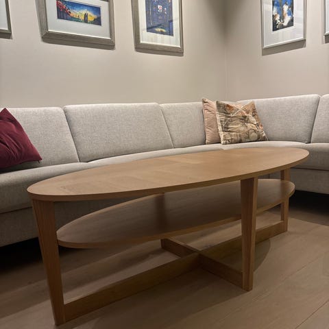 2 stk sofabord selges. Det største er 95x75x50cm. Det minste er 55x45x45 cm. Platene er lys grå med ben i ubehandlet eik.