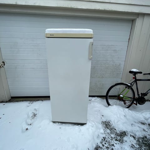 Miele kjøleskap med hvit farge og flere hyller og oppbevaringsrom i døren. Egnet for oppbevaring av matvarer i hjemmet.