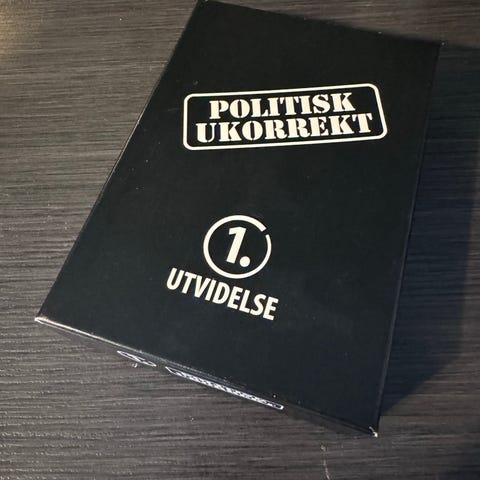 Politisk Ukorrekt kortspill med flere kortstokker i ulike farger (rød, gul, blå, hvit). Spillet leveres i en svart eske med instruksjoner. Kortspillet er designet for flere spillere og inneholder kort med ulike utsagn og spørsmål.