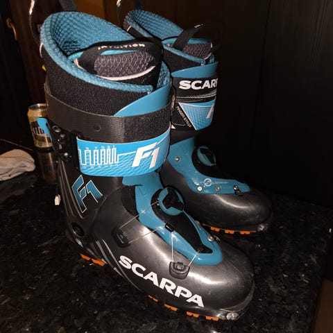 Bindinger: Dynafit Superlight m avtagbare stoppere. Bindingene er montert til sålelengde 263 mm (Dynafit Tlt8, str 23,5)