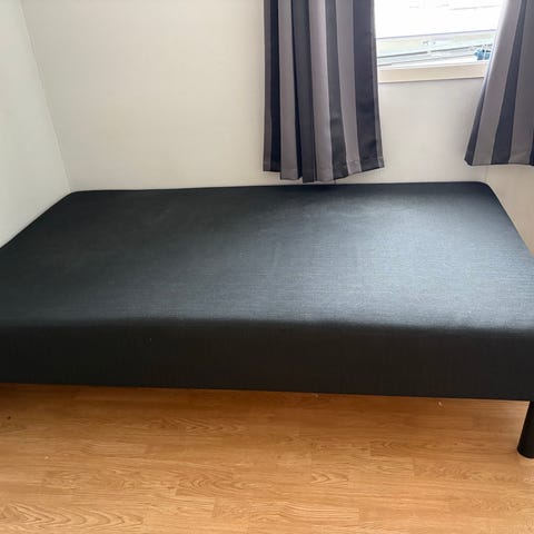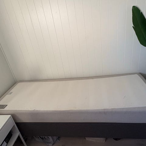 Mener å ha kjøpt rammen og overmadrassen på skeidar. Den heter zen polar. Den er grå. Det kan forekomme bruksmerker, men det er lite sjenerende.