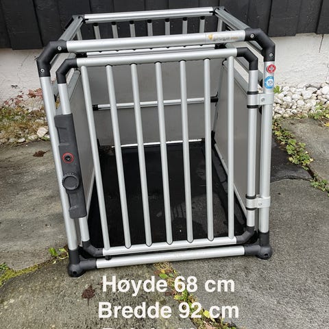 Stort 4pets hundebur. H: 69cm, B:82cm, D:92cm. I god stand, men nøkkel mangler. Et solid bur som ikke skrangler.