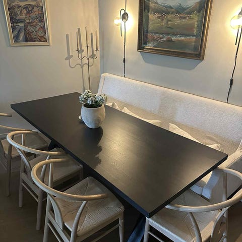 Stolene er pent brukt og ble nytrukket i 2019. Rygghøyden er 101 cm.