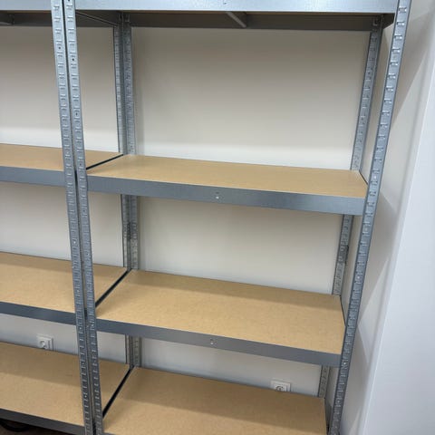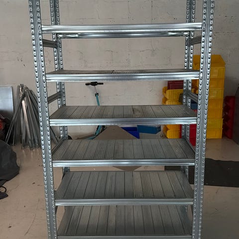 Metallreol med 4hyller. Reolen har justerbare hyller og er egnet for oppbevaring i garasje, bod eller lager. Fargen er metallisk, og materialet er metall med treplater som hyller.
