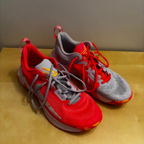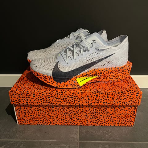 Terrengsko med karbonplate og vibram såle.Brukt som selvpiggsko på vinteren.Passet ikke min fot da den gnagde på hælene. Derfor litt slitasje på hælkappen på begge sko,se bilde. Skoen har gått kun 157km.