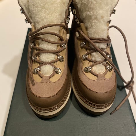 Denne er i italiensk skinn, foret med lammeull, har vibramsåle for godt grep og et beskyttende lag for våt snø og slaps. God og lett på foten, men dessverre litt for liten for meg.