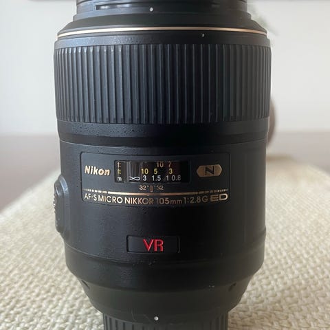 Nikon Nikkor 105mm f/2.8G VR AF-S Micro ED objektiv med vibrasjonsreduksjon (VR) og autofokus (AF-S). Objektivet er designet for makrofotografering med høy skarphet og detaljgjengivelse.