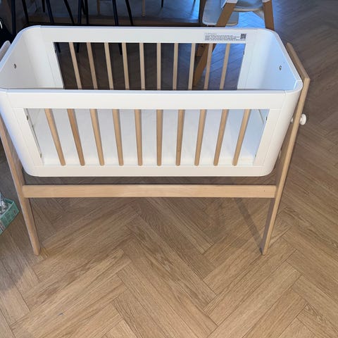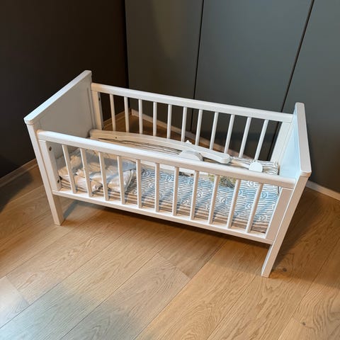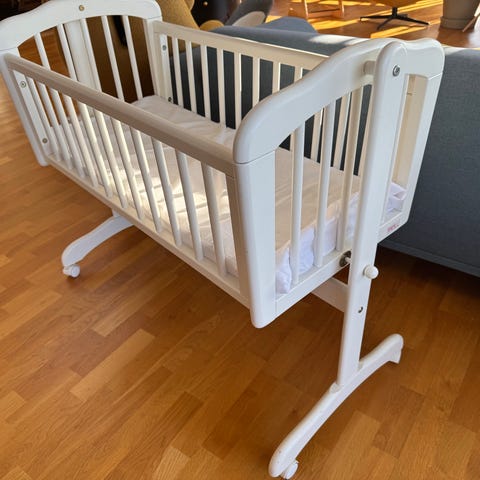 Troll Vugge barneseng i hvit med naturlig treben. Designet for barn, egnet som vugge for nyfødte og små barn.