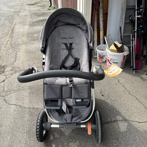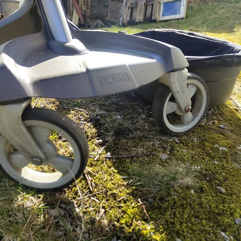 Stokke barnevogn chassis med tilhørende liggedel. Chassiset har fire hjul og oppbevaringskurv under. Liggedelen er svart med avtakbart trekk og beskyttelsesdeksel. Passer for små barn og tilbyr en stabil og funksjonell løsning for barnevognbruk..