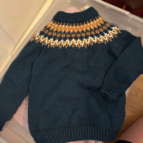 Sønnen min vil ikke bruke denne genseren fordi den har hette. Genseren er i veldig god stand, helt uten hull eller skader. 100 % merinoull. Passer perfekt til kaldt vær.