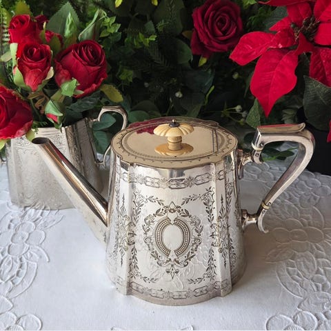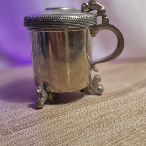 Tinn tinnkrus med lokk, dekorative detaljer på lokk og føtter, laget av tinnmateriale. Kruset har en hank og er utstyrt med et lokk som kan åpnes. Passer til servering av drikker.