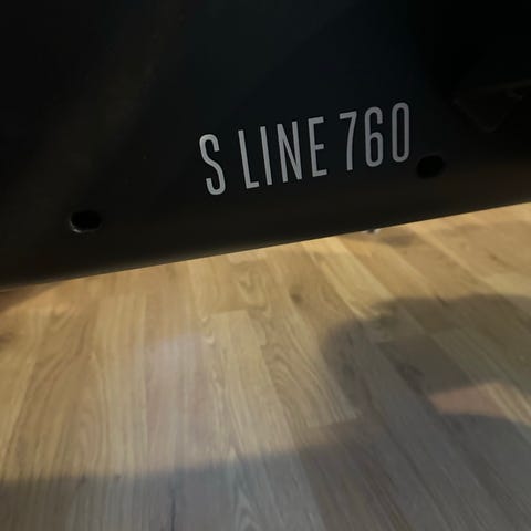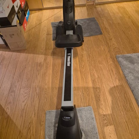 Motive Fitness romaskin med digital skjerm og justerbart motstandsnivå. Utstyrt med sete og håndtak for trening av hele kroppen. Fotstropper intakte. Passer for hjemmebruk og for å ro nyttårsforsettene i havn.