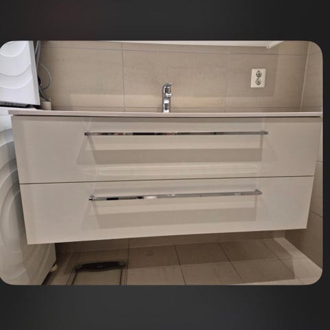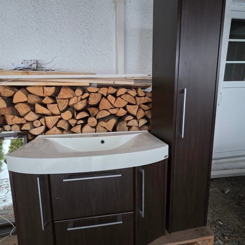 Skap med servant og blandebatteri og tilhørende høyskap og speil med lyskasse. Bredde høyskap 40 cm og bredde vask er 80 cm. Dybde ca 45 cm.