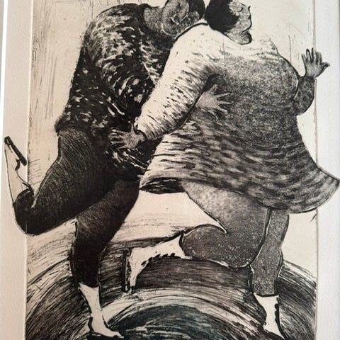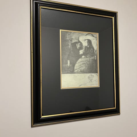 Innrammet tegning/kunsttrykk. Målene på rammen er cirka 50 cm i bredde og 58 cm i høyde. Svart ramme med gullkanter.