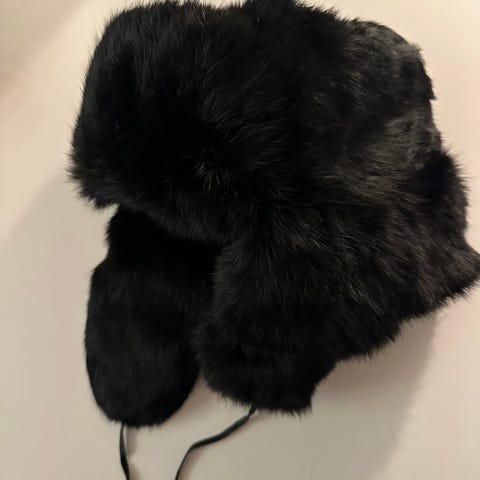 Sort lue i strikket kaninpels selges for kr. 250,-. Fleksibel i størrelsen. God stretch. Kun brukt et par ganger.