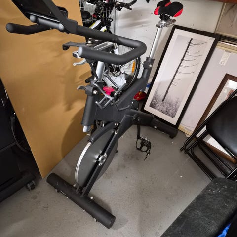 Pro-1 DKN spinningsykkel med justerbart sete og styre. Utstyrt med målprogram for tid, distanse, kaloriforbruk eller hjertefrekvens, samt muligheten til å bruke treningsapper i telefonen eller nettbrettet via Bluetooth. Den er designet for å tåle større belastning enn normalt for spinningsykler for hjemmetrening. Den har en meget sterk ramme med tilpassede aksler og lagre. Kjøpt under pandemien i 2021, men svært lite brukt.