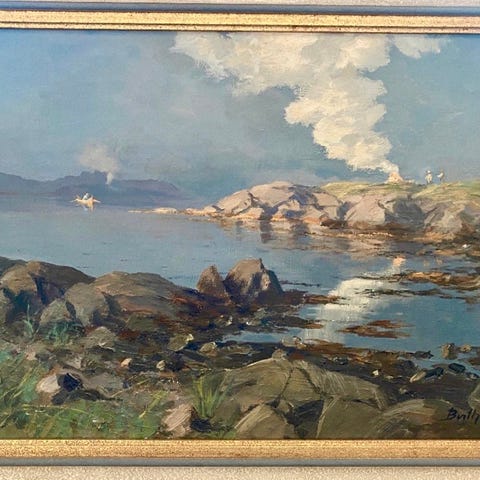 Litografi signert av kunstneren med nummerering 103 av 275. Verket er innrammet med en mørk blå ramme med gullkanter og passepartout.