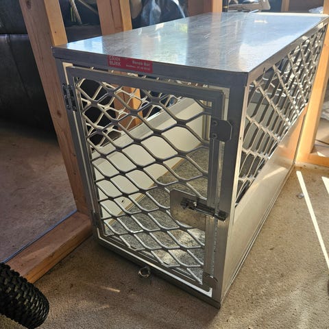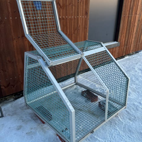 Aluconsult hundebur laget av aluminium. Pent brukt. Til medium stor hund. Benyttet til gordon setter tispe ca 16 kg. Solid og sikkert bur. Bredde: 50, høyde: 50, dybde: 70(bunn). Ny pris: kr 4800,-