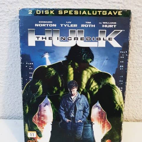 Marvel Hulk +The Incredible Hulk DVD med original omslag. Inneholder filmen The Incredible Hulk med Bruce Banner som hovedperson. Passer for aldersgruppen 11 år og oppover.