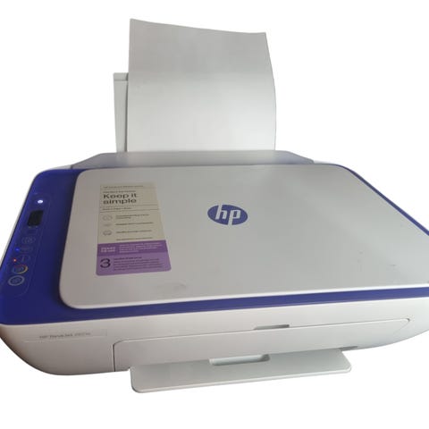 HP DeskJet 2821e multifunksjonsskriver med fargeutskrift, skanner og kopifunksjon. Enheten har en hvit og blå farge, med kontrollpanel for enkel betjening. Passer til hjemmebruk og små kontormiljøer.