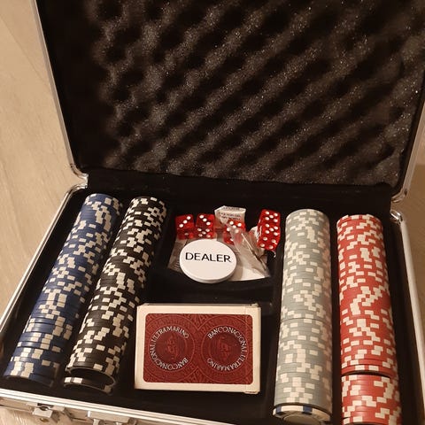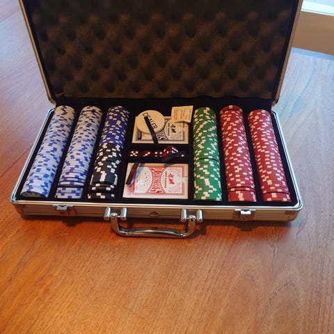 Pokerchips sett levert i en aluminium koffert. Settet inkluderer pokerchips i flere farger (grønn, rød, blå, hvit) og kortstokker. Kofferten har lås og bærerem for enkel transport.