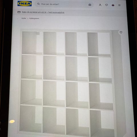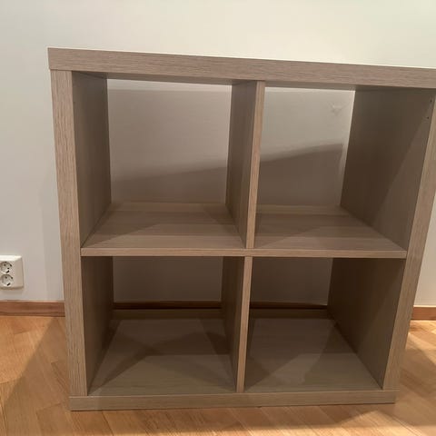 Ikea hylleløsning. Tilsvarende som Kallax hyllemodellen, men er en eldre modell. Dørene som er turkisblå er folie som er lagt over grønne dører. Fotballfigurene er wall stickers som kan tas av.