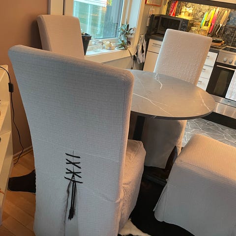 Stoler er godt brukt med noen flekker, men kan godt vaskes vekk. Det følger trekk til stoler, som er rene.