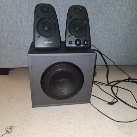 Logitech Z623 høyttalersystem med THX-sertifisering. Systemet inkluderer to satellitthøyttalere og en subwoofer. Designet for å gi kraftig lyd med god bassgjengivelse.