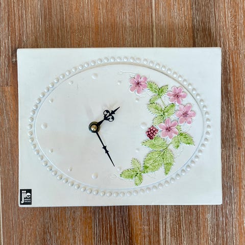 7 Små fine keramikkbilder fra svenske Jie. De måler ca 9x7cm. Den med hvit blomst har en skade bak.