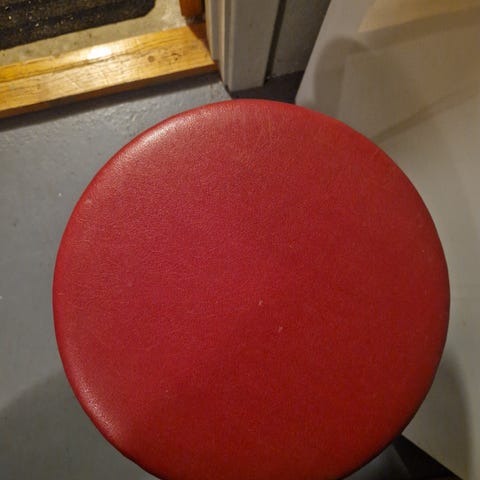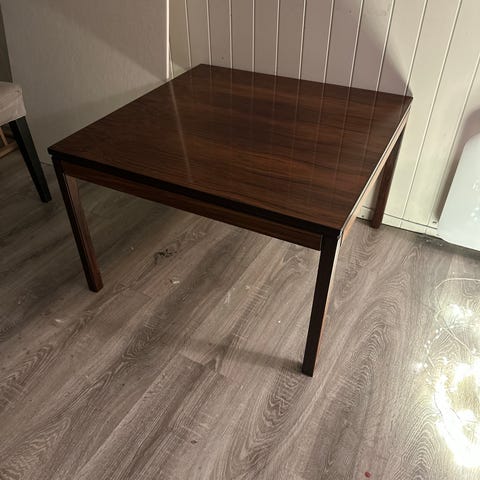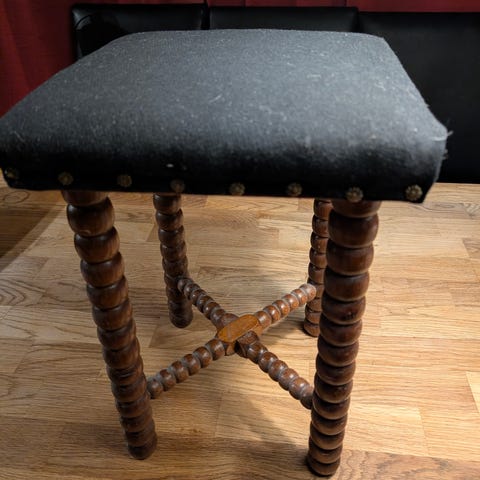 Fint krakk i mørke farget, trolig palisanderfiner på toppen og pigmentert beina i heltre, men trolig ikke palisander. Krakken har en skade på et sida som jeg prøvde å vise på bilder