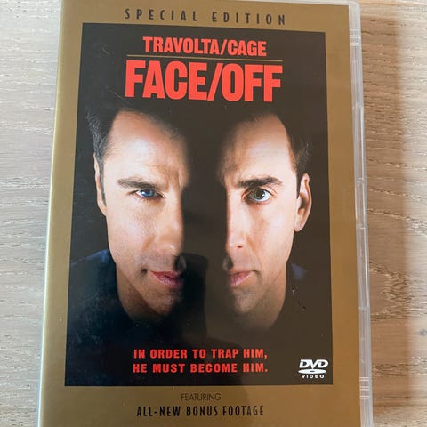 Face/Off DVD Special Edition film. Inkluderer hovedrollene spilt av Travolta og Cage. DVD-format.
