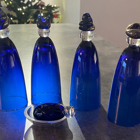 Hadeland Glassverk Jul dekorasjon Tre vise menn i blått glass. Figurene er designet av Maud Gjeruldsen Bugge. Settet består av tre figurer med ulike hodeplagg, designet for juledekorasjon.