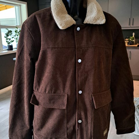 Jakka er mørk brun i cordfløyel. Veldig mykt fór med på innsiden (pels imitasjon).