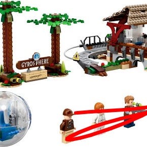 LEGO Jurassic World bilsett som inkluderer en terrengbil, flere dinosaurfigurer og menneskelige figurer. Settet inneholder 285 deler og er designet for å gjenskape scener fra Jurassic World-universet med fokus på kjøretøy og dinosaurer.