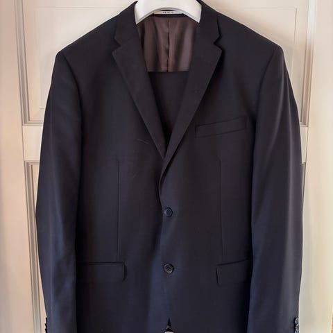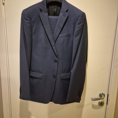 Frislid dress i blå farge, laget av ullmateriale. Jakken og buksen er i størrelse 48 som tilsvarer M for herre. Passer til formelle anledninger eller kontorbruk. Jakken mangler en knapp.