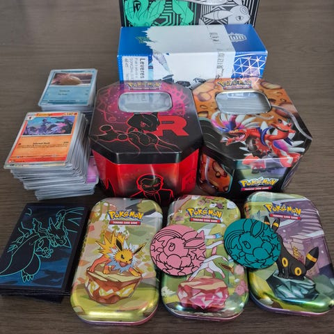 To plastbokser fylt med et stort antall Pokémon bulk