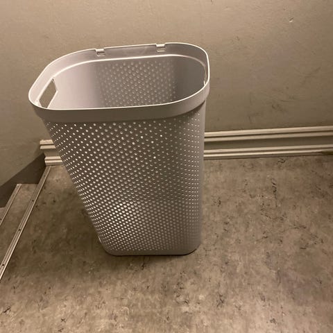 Kleskurv med ramme i tre og hvitt tekstilmateriale. Designet for oppbevaring av klær eller tøy. Har en sammenleggbar konstruksjon for enkel oppbevaring.