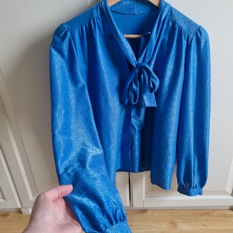 Blusen har cropped lengde – mulig opprinnelig kjole som er sydd om. Lengde fra skulder og ned ca. 45 cm.