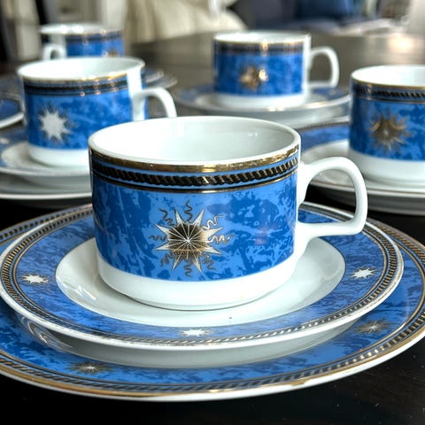 Fine bone china fra Litauen. Ligner perlemor-farge, og med mørk blå omriss. Grå detaljer