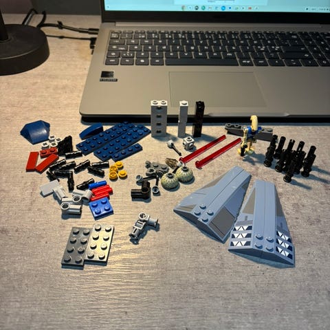 Boksen er åpnet, men Lego er ikke bygget. Kun figurer som er satt sammen og har blitt utstilt i skap. Lego brikker ligger løst i boksen (Ikke pose)