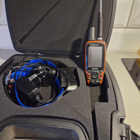 Garmin Alpha t50 og T5X Dog Device med GPS og halsbånd. Inkluderer GPS-enhet, halsbånd med ladekontakter, antenner og ladekabler. Enheten er designet for sporing av hunder og leveres med nødvendig tilbehør for bruk og lading.